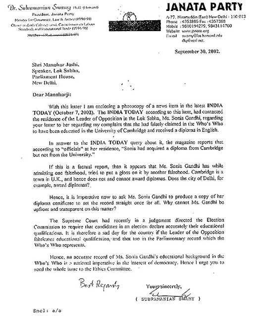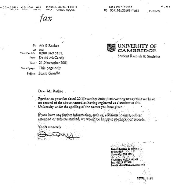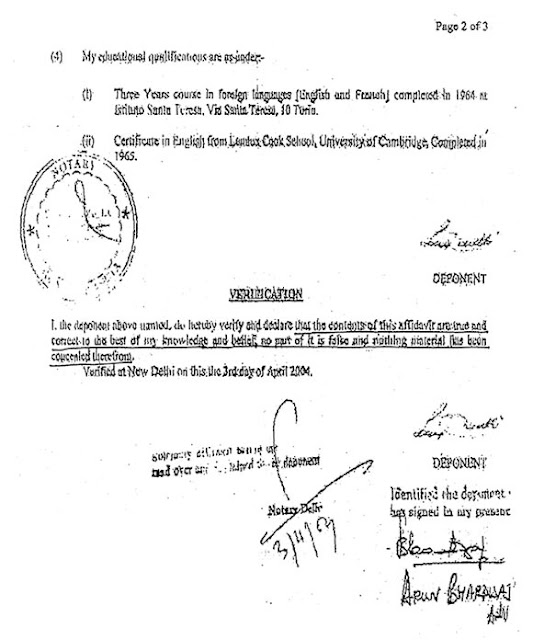 Third, Sonia Gandhi has not studied beyond High School. She has falsely claimed in her affidavit filed as a contesting candidate before the Rae Bareli Returning Officer in the 2004 Lok Sabha elections that she is qualified and got a diploma in English from the prestigious University of Cambridge, UK